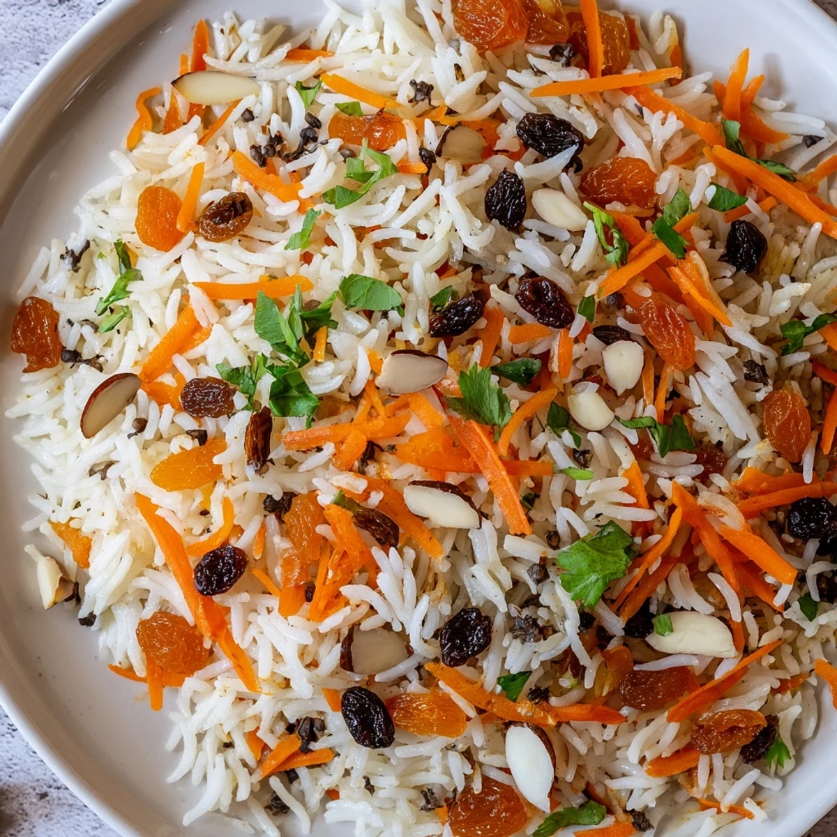 Golden carrots and plump raisins add sweetness and texture, while toasted almonds bring a satisfying crunch. The layered flavors create a perfect balance of savory and sweet, making it an ideal accompaniment to lamb or chicken, or substantial enough to shine on its own.