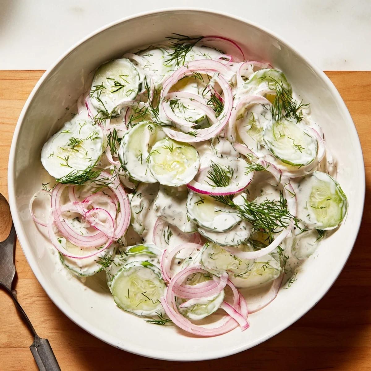 This cooling side dish combines thinly sliced cucumbers and red onions with a smooth, tangy dressing made from sour cream, mayonnaise, and fresh dill. The creamy coating balances the crisp vegetables perfectly, while white wine vinegar adds brightness.