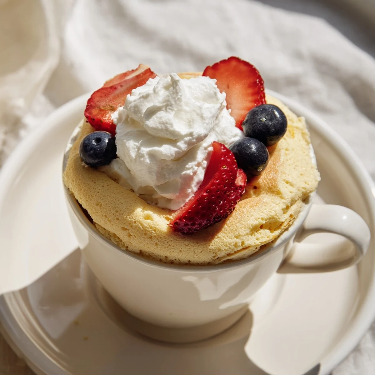 - Let the mug sit for one to two minutes. The cake will deflate slightly as it cools. Top with whipped cream and berries while still warm.