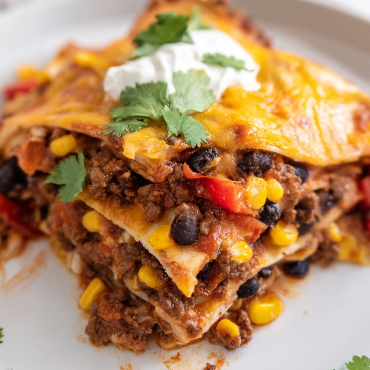 This hearty Tex-Mex inspired dish transforms classic lasagna into something uniquely flavorful by swapping traditional pasta for soft flour tortillas. Ground beef gets seasoned with taco spices, then combined with black beans, sweet corn, and diced tomatoes for a robust filling. The layers build beautifully: tortillas, savory meat mixture, and generous amounts of shredded Mexican cheese that melts into gooey perfection. After baking, the cheese turns golden and bubbly while tortillas absorb all those delicious spices. Let it rest briefly before slicing to help layers hold together beautifully. Top with fresh cilantro, jalapeños, or cool sour cream to add bright contrasts against the rich, spiced layers.